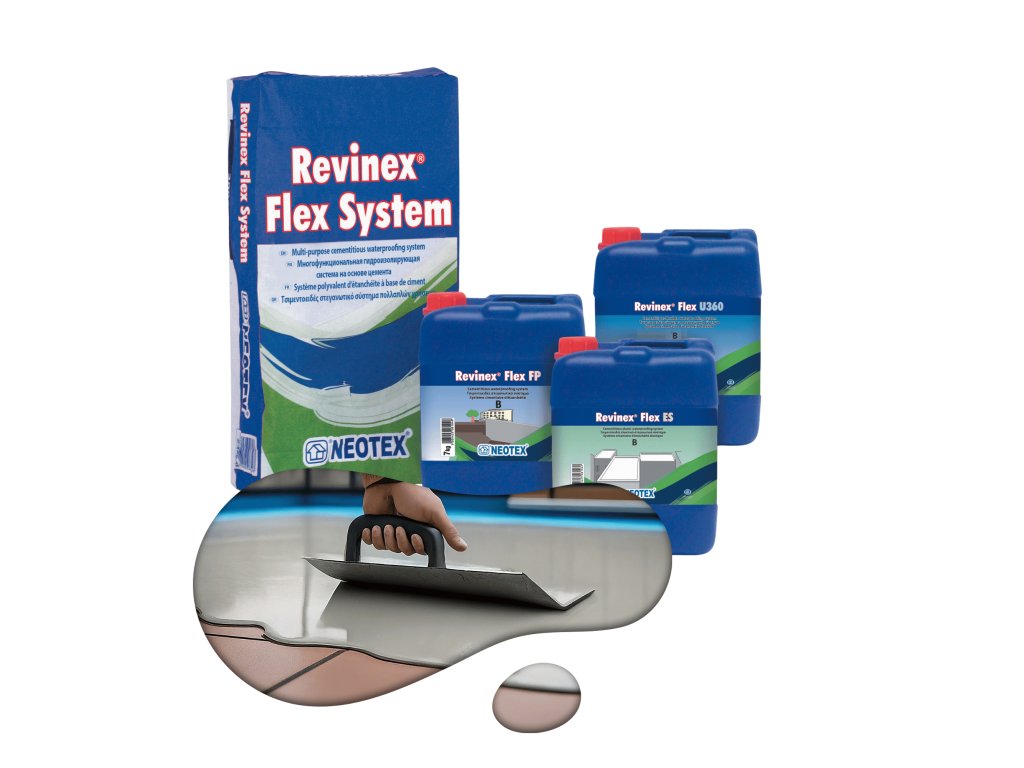 Revinex® Flex + Revinex® Flex U360 je dvousložkový, flexibilní cementový hydroizolační systém určený pro použití v interiéru i exteriéru. Kombinuje cementovou složku Revinex® Flex (složka A) s polymérovou tekutou složkou Revinex® Flex U360 (složka B), čímž vytváří vysoce elastickou a vodotěsnou membránu.