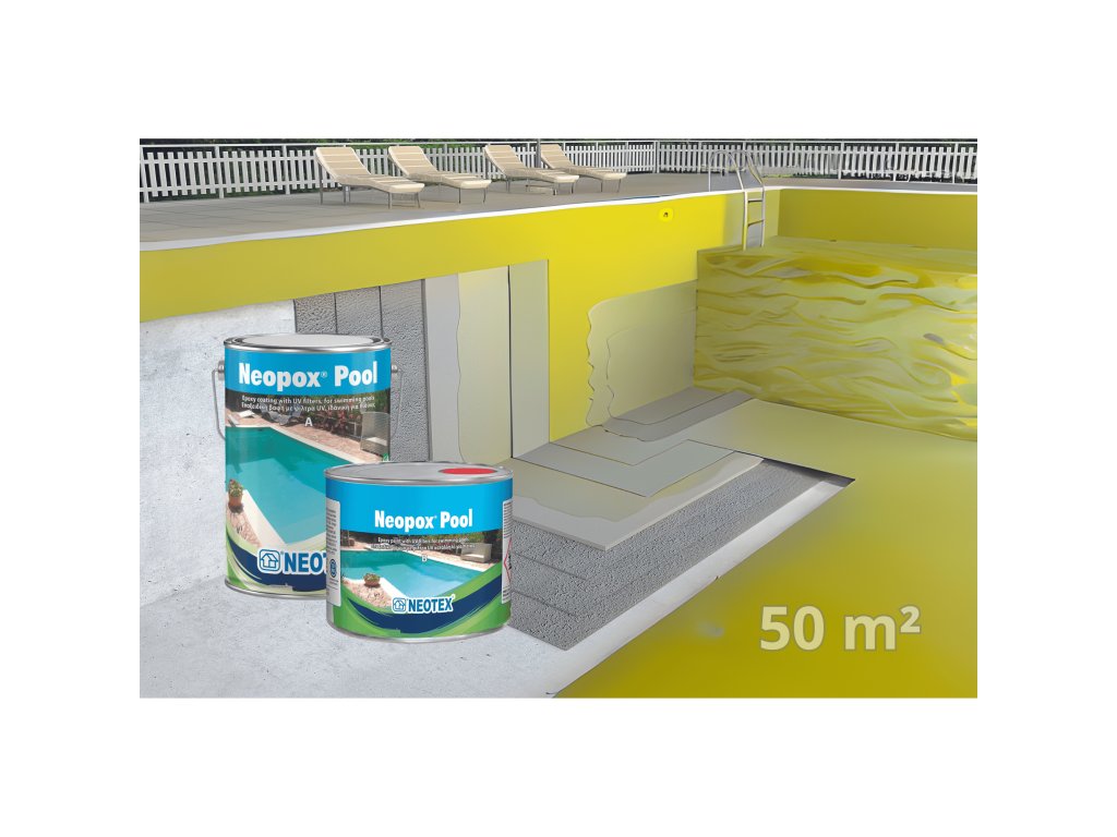 Hladký epoxidový povlak se nanáší po zaschnutí základního nátěru. Po zaschnutí základního nátěru se doporučuje nanést první vrstvu Neopox® Pool naředěného 8 % hmot. rozpouštědlem Neotex® 1021 válečkem, štětcem nebo bezvzduchovým stříkáním. Druhá vrstva se nanáší stejným způsobem ~24 hodin po nanesení první vrstvy (závisí také na atmosférických podmínkách), naředěná 4-8 % w/w rozpouštědlem Neotex® 1021. Při případných dalších vrstvách se Neopox® Pool ředí 4 % hmot. rozpouštědlem Neotex® 1021. Obe zložky A a B se smíchají v předem stanoveném poměru (75A : 25B w/w) a po přidání rozpouštědla se míchají během aplikace. 3 - 5 minut elektrickým míchadlem s nízkými otáčkami. Důležité je důkladně promíchat na dně nádoby, stejně jako po stranách, aby se tuhnutí (složka B) rovnoměrně rozložilo. Směs se nechá krátce působit v nádobě (~1 minuta) a poté se aplikuje. Před mícháním se doporučuje mechanické míchání složky A.
