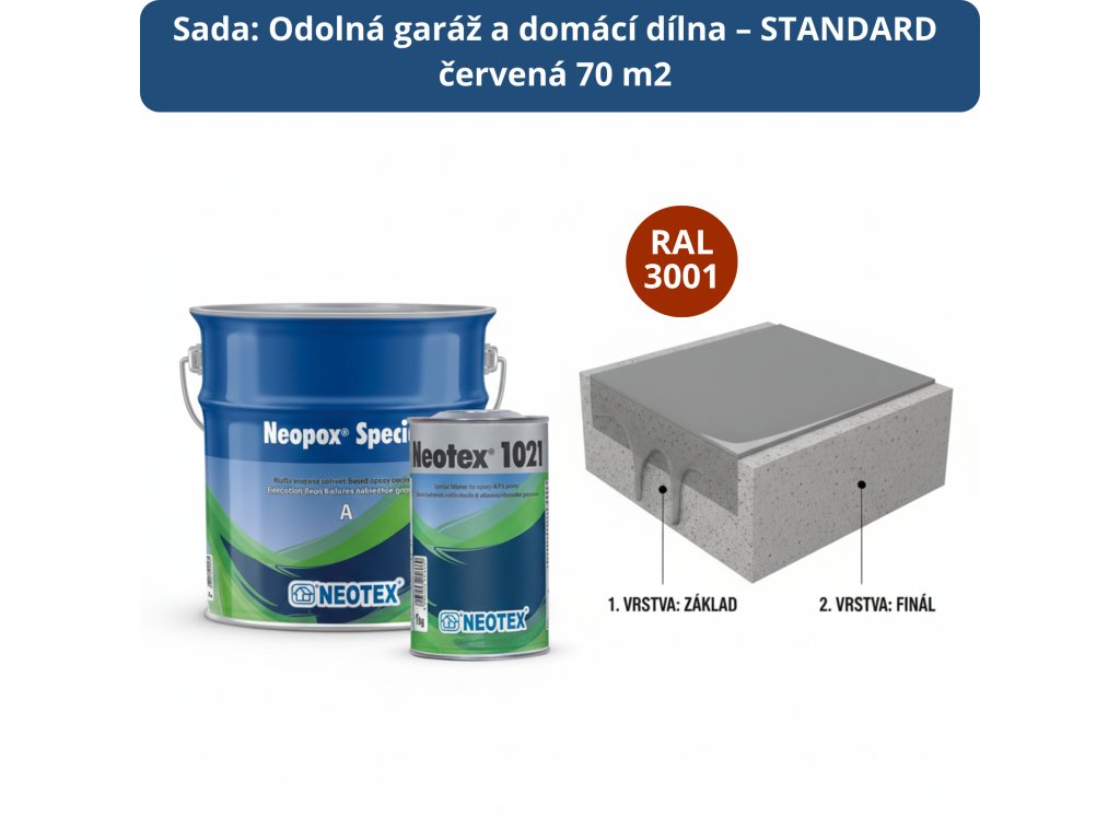 | Neopox Special červená – 5 kg sada | 4× 5 kg (A+B) | Hlavní epoxidový nátěr (2 vrstvy) |