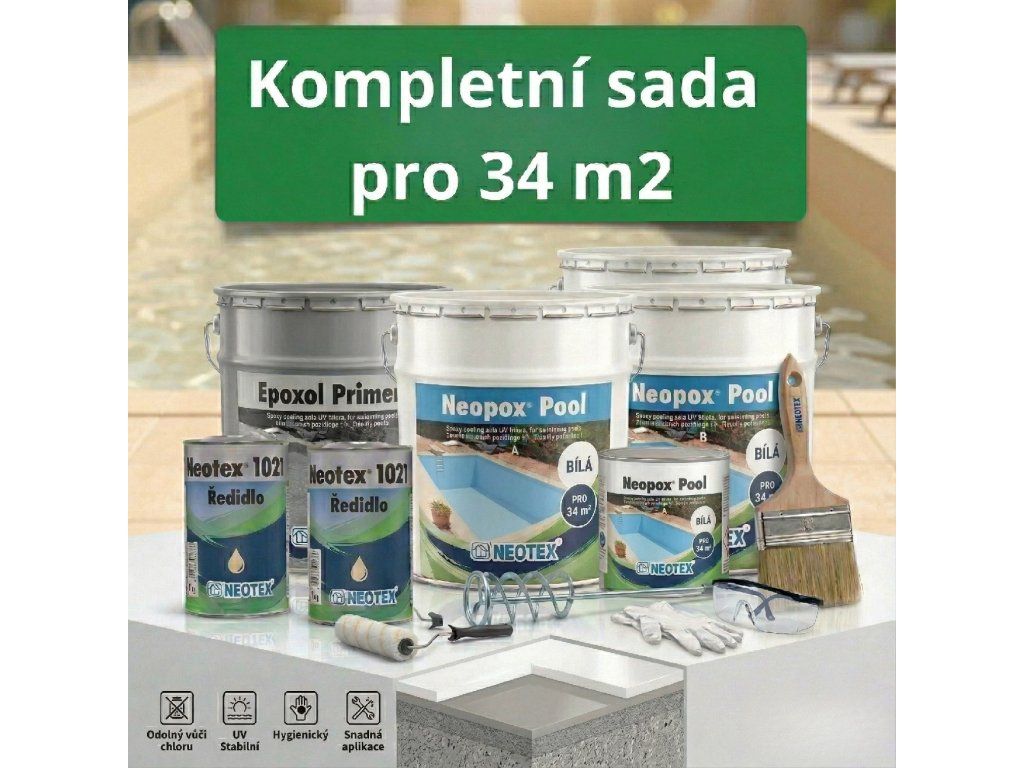 Kompletní sestava pro profesionální renovaci bazénu o ploše 34 m² v bílá barvě. Obsahuje epoxidový primer a bílá epoxidový nátěr Neopox Pool s UV filtry.