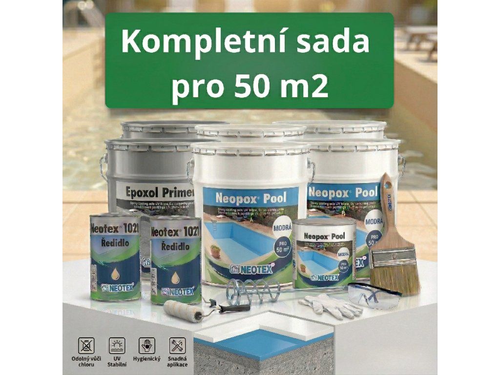 Kompletní sestava pro profesionální renovaci bazénu o ploše 50 m² v modrá barvě. Obsahuje epoxidový primer a modrý epoxidový nátěr Neopox Pool s UV filtry.